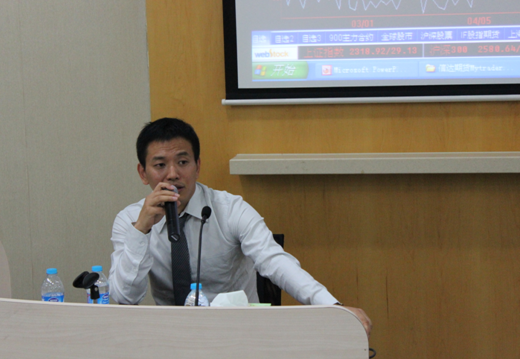 何老师在讲课过程中预留了大量的互动时间。同学们热情高涨,提出了众多问题,涉及到何老师的个人经历、交易故事及具体的交易操作等等,不一而足。其中,何俊先生不止一次地强调交易员具备平和心态的重要性。他说:“交易过程中每当我不断地想着赚钱时,我往往会赔;当我心平气和时,往往会有意外的收获。”对于短线交易,他建议不要被繁芜庞杂的信息所干扰,在此影响下会有思维定势,交易时的灵活性将大为降低。