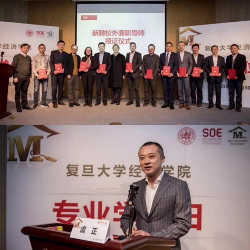 院长张军教授、研究生院副院长陈焱教授、研究生院副院长楚永全副教授、研究生院副院长先梦涵老师、研究生院副院长高帆教授为12位新聘校外导师授证。 上海德勤资产评估有限公司合伙人虞正先生作为新聘导师代表发言。他在发言中表达了两点想法。第一,他认为现实的工作跟大学有密切的联系,在学校里面学习到的方法在工作中会广泛使用;第二,在大数据、区块链等技术日新月异的当下,他号召同学们毕业后可以加入资产评估行业,为行业、为社会做更多的事情。