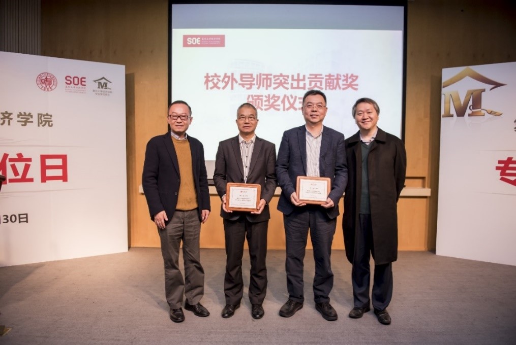 院长张军教授和研究生院副院长陈焱教授分别为普华永道中国合伙人陈少瑜先生和东方证券副总裁杨玉成先生颁发了优秀校外导师突出贡献奖荣誉证书。