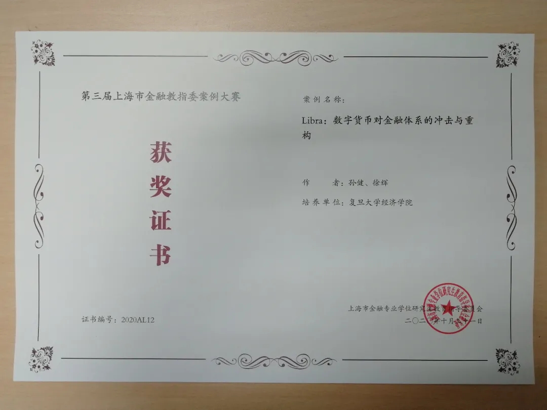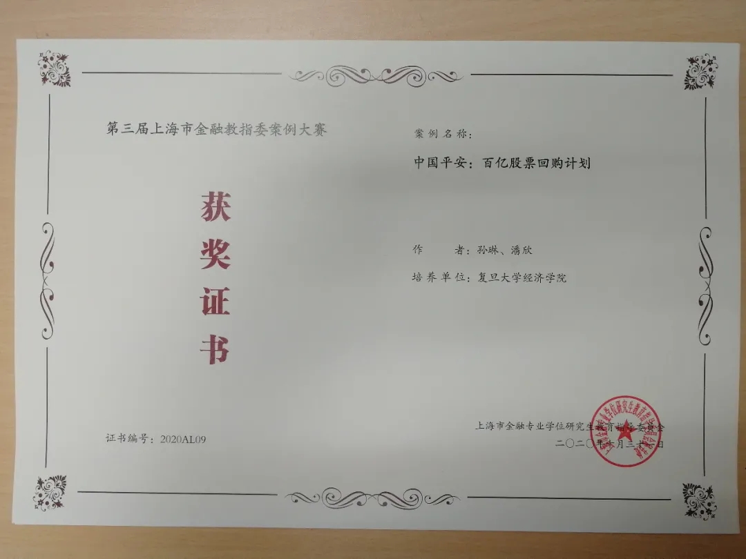 黄明老师、陈恩撰写的《千山药机:商誉减值风险与股权质押爆仓》,卢华老师、马思敏、李梦梦、刘佳、王健撰写的《奇艺世纪知识产权ABS:玩转反向保理,开辟知识产权融资新路径》,陆前进老师、朱晓宇撰写的《双重股权制度研究——以拼多多为例》,孙琳老师、潘欣撰写的《中国平安:百亿股票回购计划》,孙健老师、徐辉撰写的《Libra:数字货币对金融体系的冲击与重构》在第三届上海市金融教指委案例大赛中获得优秀案例奖。