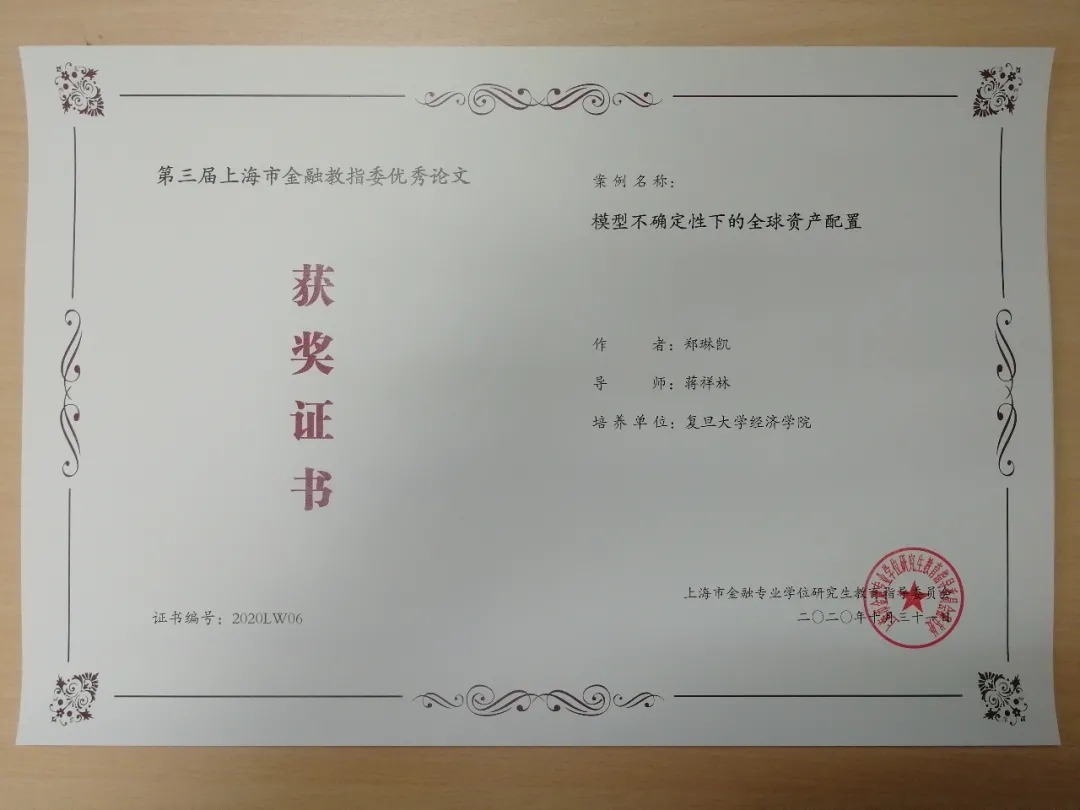 由宋军老师指导王禹涵同学撰写的《基于Barra模型的上市公司净经营资产因子及投资策略研究》,蒋祥林老师指导郑琳凯同学撰写的《模型不确定性下的全球资产配置》,罗忠洲老师指导董方红同学撰写的《股票涨停后的投资者行为研究》在第三届上海市金融硕士优秀论文评选中荣获优秀论文奖。
