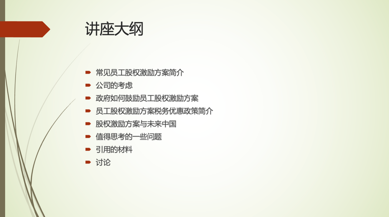 本次讲座,陈老师从以下几个角度展开:常见的员工股权激励方案、公司的考虑、政府如何鼓励员工股权激励方案、员工股权激励方案税务优惠政策、股权激励方案与未来中国、值得思考的一些问题。