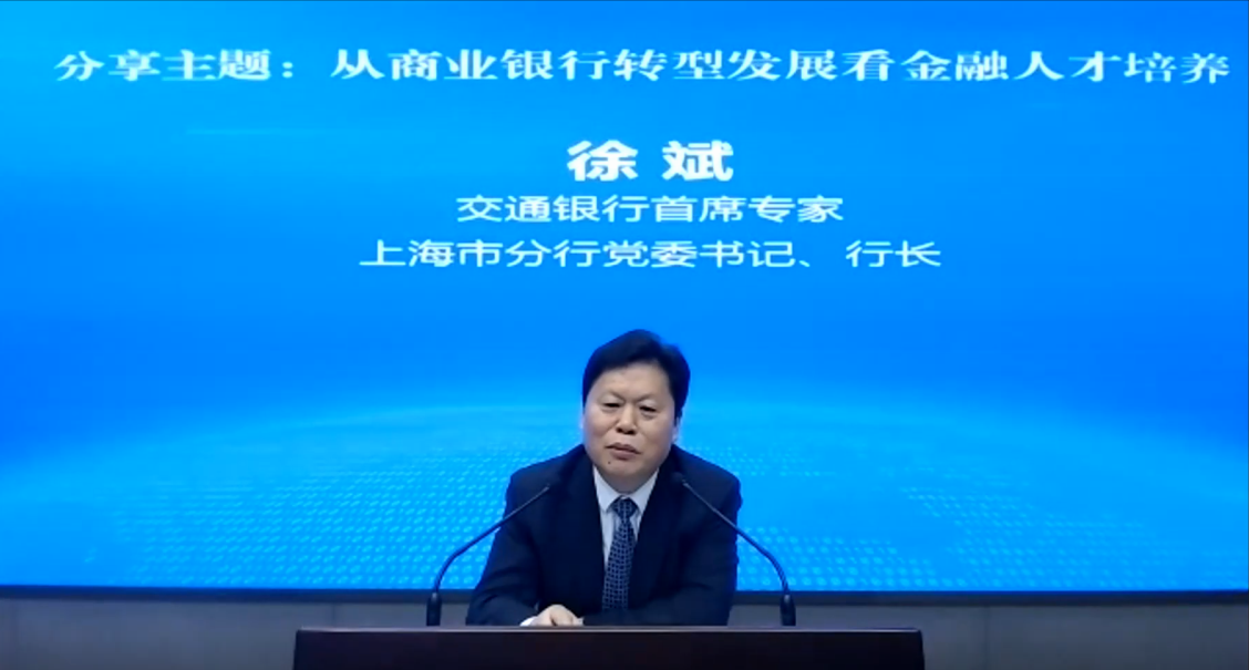 交通银行首席专家、上海市分行党委书记、行长徐斌以“从商业银行转型发展看金融人才培养” 为题发表演讲。徐斌先生首先讲述了国际国内的经济大趋势,全球经济上呈现出新周期、再平衡、经济重心东移这些特点,中国经济进入了新时代,国家提出了新发展理念和新发展格局。在这样的经济背景下,对于未来商业银行的转型发展,徐斌先生从坚持走中国特色社会主义金融之路出发,提出了四个看法:一是商业银行要朝着全面现代化方向发展,解决制度性利差发展模式终结、金融脱离实体经济等问题;二是全面促进银行业的创新发展,大力发展科技金融和绿色金融;三是持续提升商业银行的数字化水平,构建数字化平台;四是牢牢守住金融风险,确保经济平稳运行。同时,徐斌先生从银行业对人才的需求出发,对同学们提出了五点建议:一是善于站在时代大背景下思考问题;二是具有创新探索的能力;三是培养数字化的思维和应用能力;四是加强自身领导力和管理能力建设;五是成为德才兼备的人才。