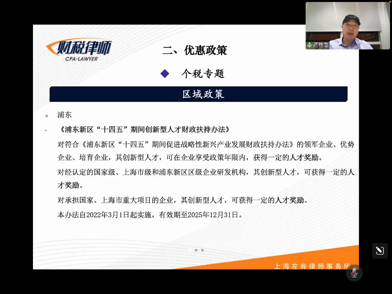 本期课程,严老师先对上一期讲述的个人所得税专题进行收尾,重点阐述了我国在区域层面的人才激励税收政策,简要介绍了浦东、粤港澳大湾区和海南等地,为吸引人才而出台的税收优惠政策。