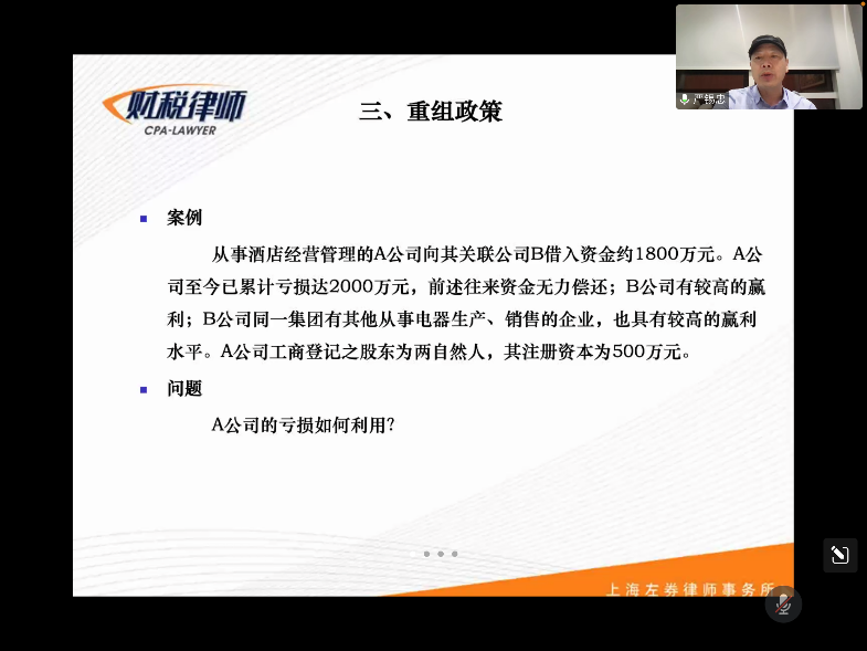 随后,严老师以案例引出了本期课程的主要内容——我国的重组政策。案例的核心问题是,企业向关联公司借出的款项,如果因关联公司亏损而无法收回,那么该企业的这笔坏账应当如何处理,以实现税前扣除?围绕这个案例,严老师引导同学们先后探讨了计提坏账准备金、直接作为坏账税前列支的可行性,并指出,根据我国税法,上述两种方法并不适用于与生产经营无关的往来款项,不具备可行性。接着,严老师提出,是否能够通过并购重组相关的税务安排使这笔款项实现税前列支呢?在同学们的回答中,严老师穿插着介绍了并购重组的发展历史、类型和定义,并指出,作为并购重组的一种方式,债转股可以被用于本案例的税务安排。