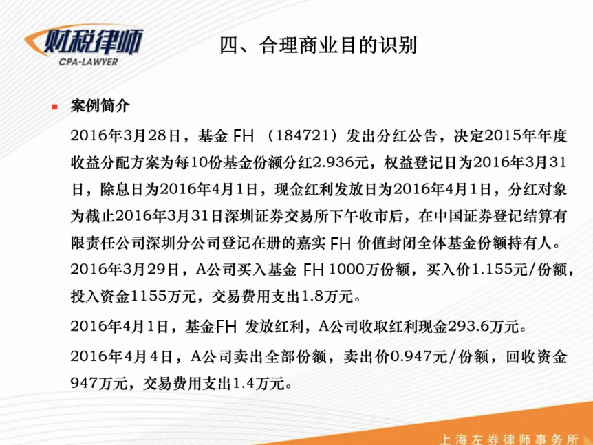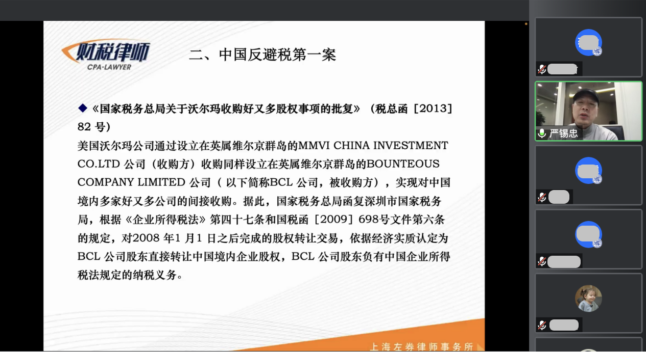 在诠释完“合理商业目的”的两个测试标准后,严老师基于“基金FH”案例与同学们进行了进一步探讨,帮助同学们加深对于“合理商业目的”的理解和运用。严老师总结道,风险测试规则和盈利测试规则是合理商业目的测试的最终法则,并分享了我国关于“合理商业目的”的法律条款。