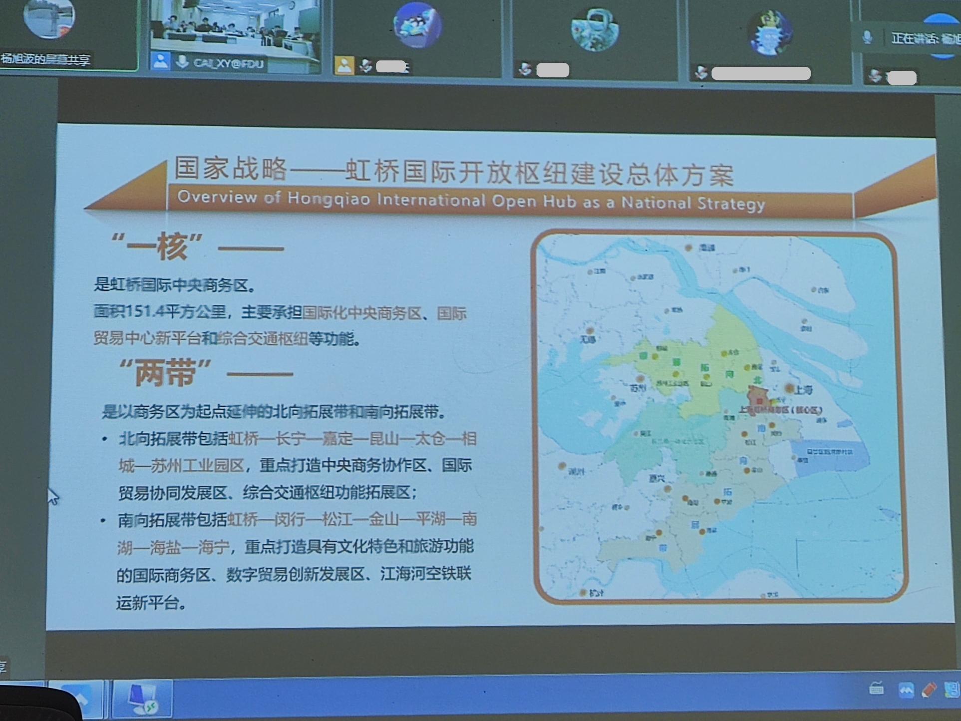 首先,杨老师将上海城市地位与发展战略总结为“中心辐射、两翼齐飞、新城发力、南北转型”。在这样的背景下,虹桥国际开放枢纽建设总体方案为“一核两带”,“一核”即虹桥国际中央商务区,“两带”为以商务区为起点延伸的中央商务协作的向北拓展区,以及国际商务和数字贸易的向南拓展区。