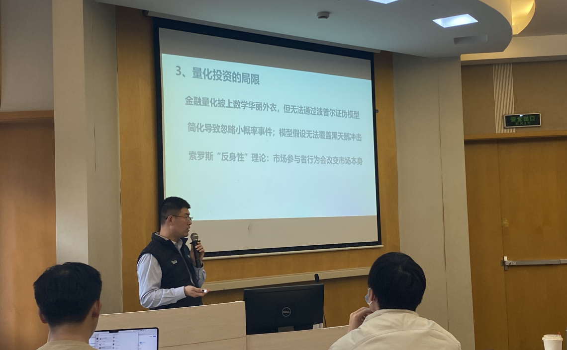 然后,王老师重点讲述了股票投资,股票投资的本质是短期投票机和长期称重机的结合。王老师通过恒大同时存在高杠杆和高分红预示爆雷和2008年金融危机大空头的案例,说明了投资需要兼备常识和逆向思维。同时,王老师以特斯拉和贵州茅台为例,说明了投资也需要有前瞻能力。此外,王老师指出,量化投资存在局限性,其模型假设无法覆盖黑天鹅的冲击。