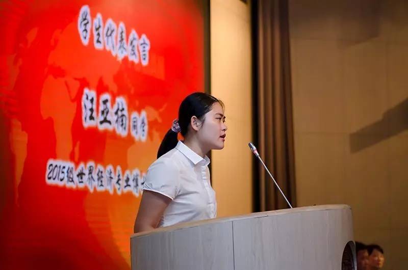 在庄严的国歌奏唱声之后,2015级世界经济专业博士研究生汪亚楠同学作为学生代表发言,汪亚楠同学热爱学术研究,曾先后荣获硕士国家奖学金、博士国家奖学金、2016年首届女性创业大赛三等奖、无码流出