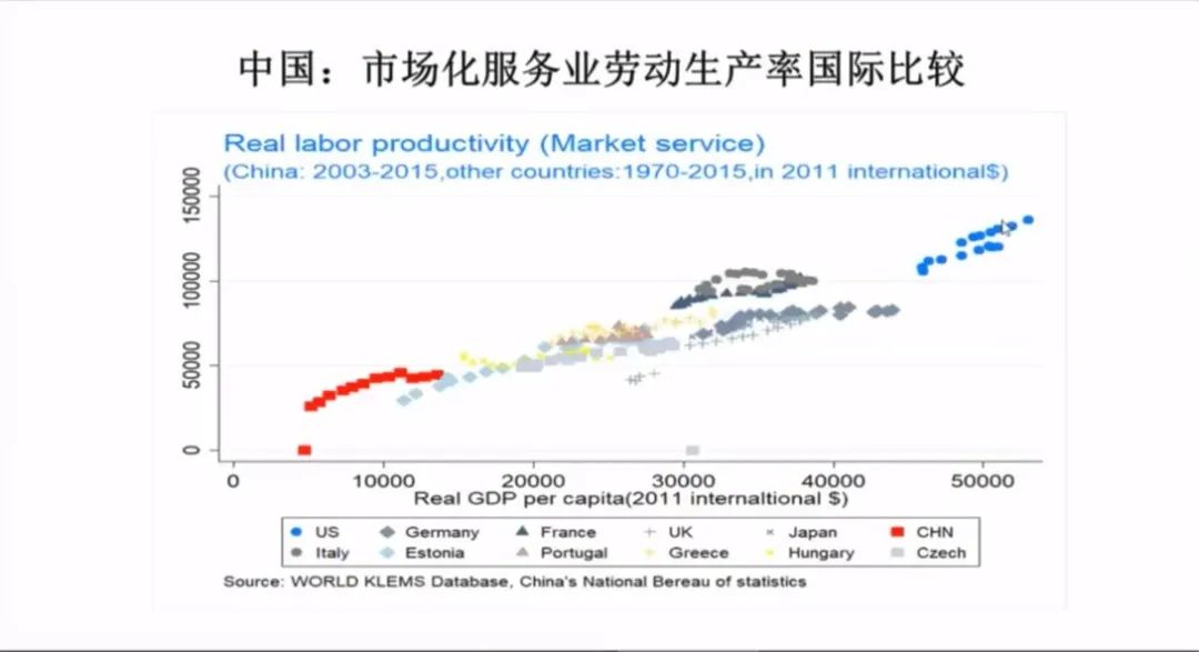 我们发现服务业市场化的劳动生产率上升还是很高的,非市场化的服务业劳动生产率不高。所以提高服务业劳动生产率,进一步演变成怎么样提高非市场化劳动生产率。