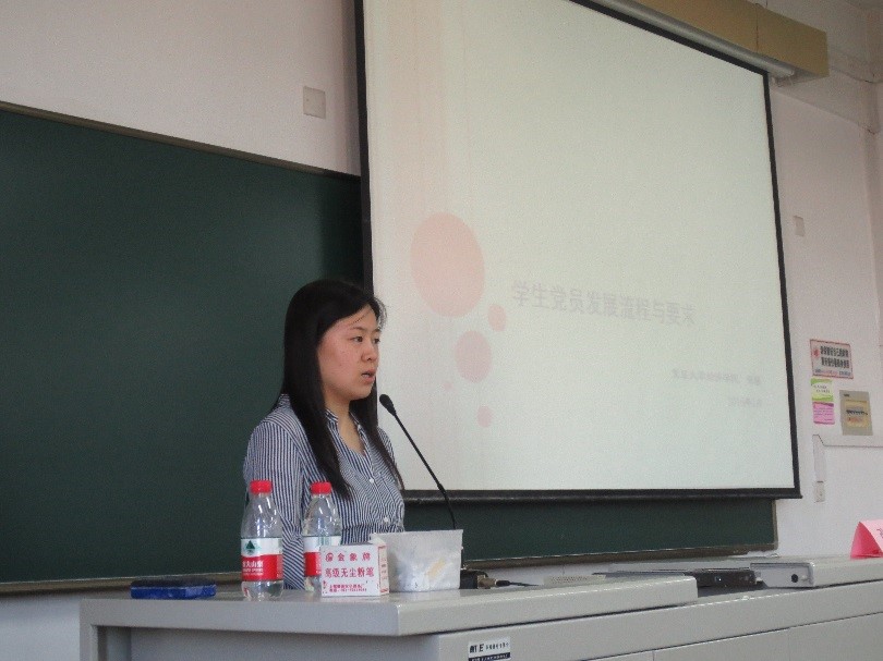 其后,蔡晓月老师介绍了本期党校的学习安排,并为本期积极分子学员作入党动机专题辅导,详细解读如何端正入党动机。蔡老师深入浅出地挖掘出了入党动机的分类与层次,同时引经据典地为大家展示了应该如何从稚嫩青涩的实体阶段,不断在动机层次的阶梯上攀登以致达到为共产主义事业奋斗终身的终极信仰。最后,蔡老师对学员们提出了思想上入党一生一世的诚挚寄语,希望优秀积极分子们的加入为党组织注入更多的活力。