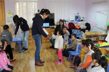 阅读结束后,张海丽同学带领小朋友们做游戏。小朋友们被分成三个小组,轮流参与游戏。张海丽同学发出指令,如“小妹妹向后转”,小朋友们玩的不亦乐乎。偶尔犯错的小朋友则为大家表演节目。每一个参与游戏的小朋友都拿到了小礼品。