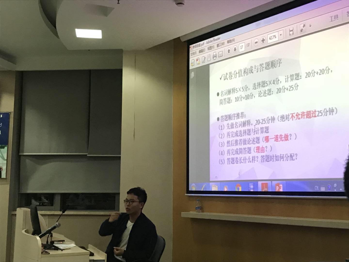 学硕的考研情况,然后开始有重点地为大家分析考研各个科目的特点和应对技巧,其中既包括复习时间分配,也包括临考时的小技巧。在场的同学们都在奋笔记下学长分享的经验,不希望错过一个细节。