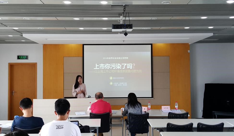 第三个项目是社会调查类项目“上市,你污染了吗?——以上海上市公司环境信息披露问题为例”项目,通过抽样调查上市公司环境信息披露情况并给予该公司评分,进行深入研究、提出建议。评委老师在询问了调查方式、对象选择、问卷设计等方面的问题后,认为其难度虽大但选题有意思,项目获得通过。