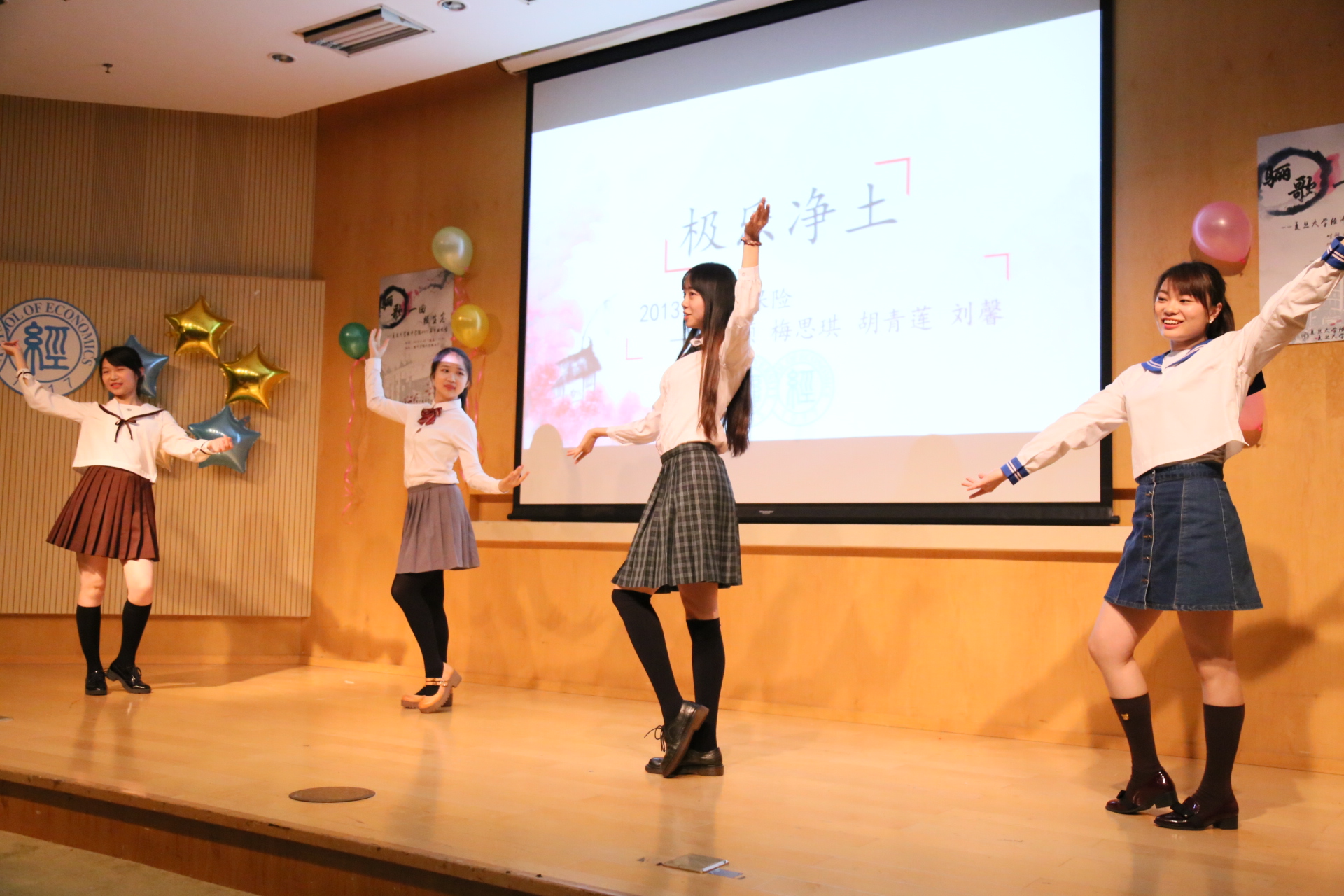 不过,接下来,就是大把的欢乐时光了,肤白貌美气质佳的杨瑞颀、梅思琪、胡青莲、刘馨同学,为我们带来的是洗脑神曲——《极乐净土》!甜美可人的长相加上优美撩人的舞姿,绝对的视觉盛宴。