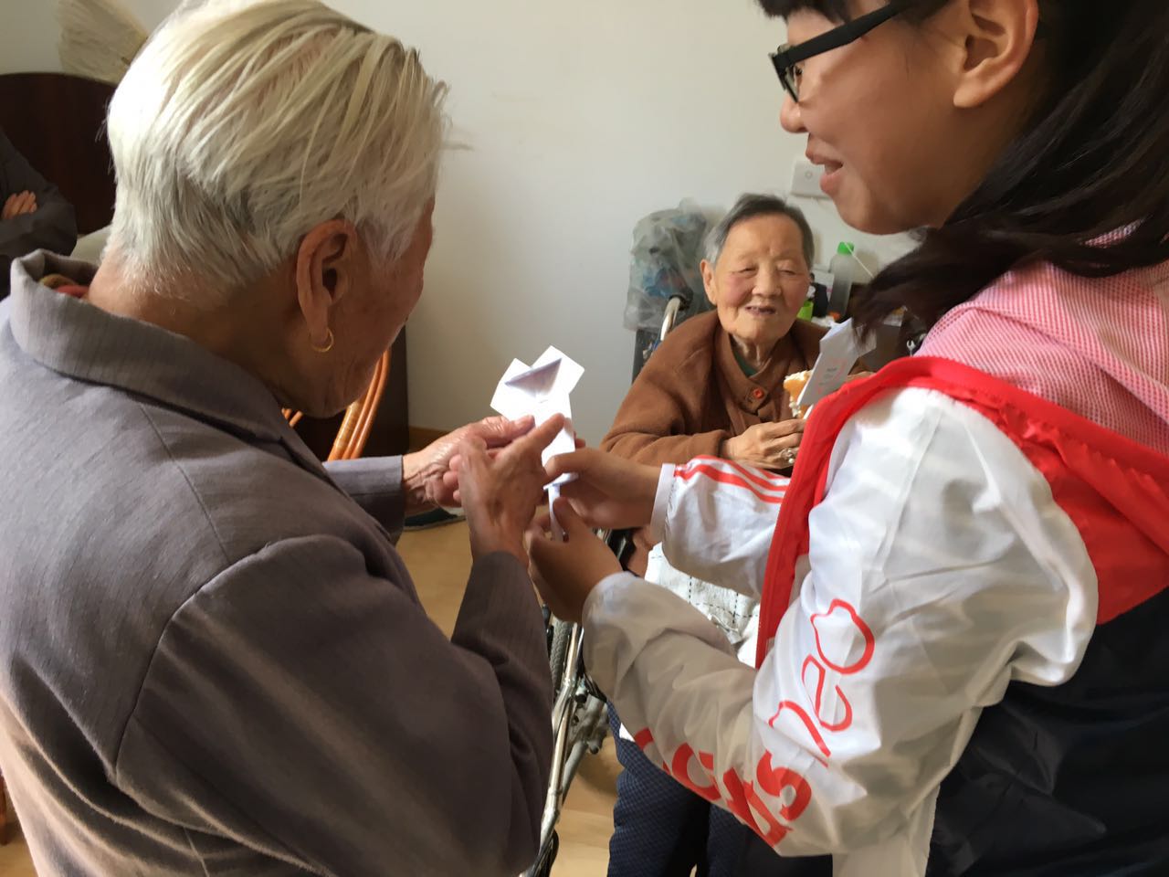 谈到这次活动,已经多次参加养老院活动的徐逸楠这样回忆到:“又一次来到了世纪养老院,等待我们的依旧是亲切的、期盼着的爷爷奶奶们。这一次,我们带来了水果和折纸,继续给爷爷奶奶折出不同的花样,送上我们独特的祝福。我和另两名同学依旧负责敬老院的二楼,有几位爷爷奶奶还记得我们,不停地说着感谢,谢谢我们的探望。”