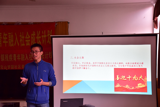 作为志愿者的我们,也在十九大期间认真学习和研究了十九大报告的具体内容,对此我们的志愿者深有感触,因此,我们安排了一次十九大主题报告,为中心的大朋友们带来一次主题展示。数理经济系的王振鹏同学非常仔细的挖掘了十九大报告的主题内涵,我们当前主要矛盾所发生的重大改变,全面建成小康社会的重要意义,以及新增内容等,为我们普及了许多有关党的知识。