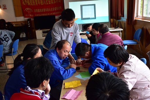 接着是制作七巧板,我们给每一桌的学员们都下发了彩纸,并在ppt中放映七巧板的制作过程。每一位大朋友都十分认真,让我们感受到了他们的热情与活力。在拼图的过程中,尽管拼的不尽完美,但大朋友们的创造力和想象力是十分丰富的。欢声笑语之间大家度过了短暂而愉快的时光。