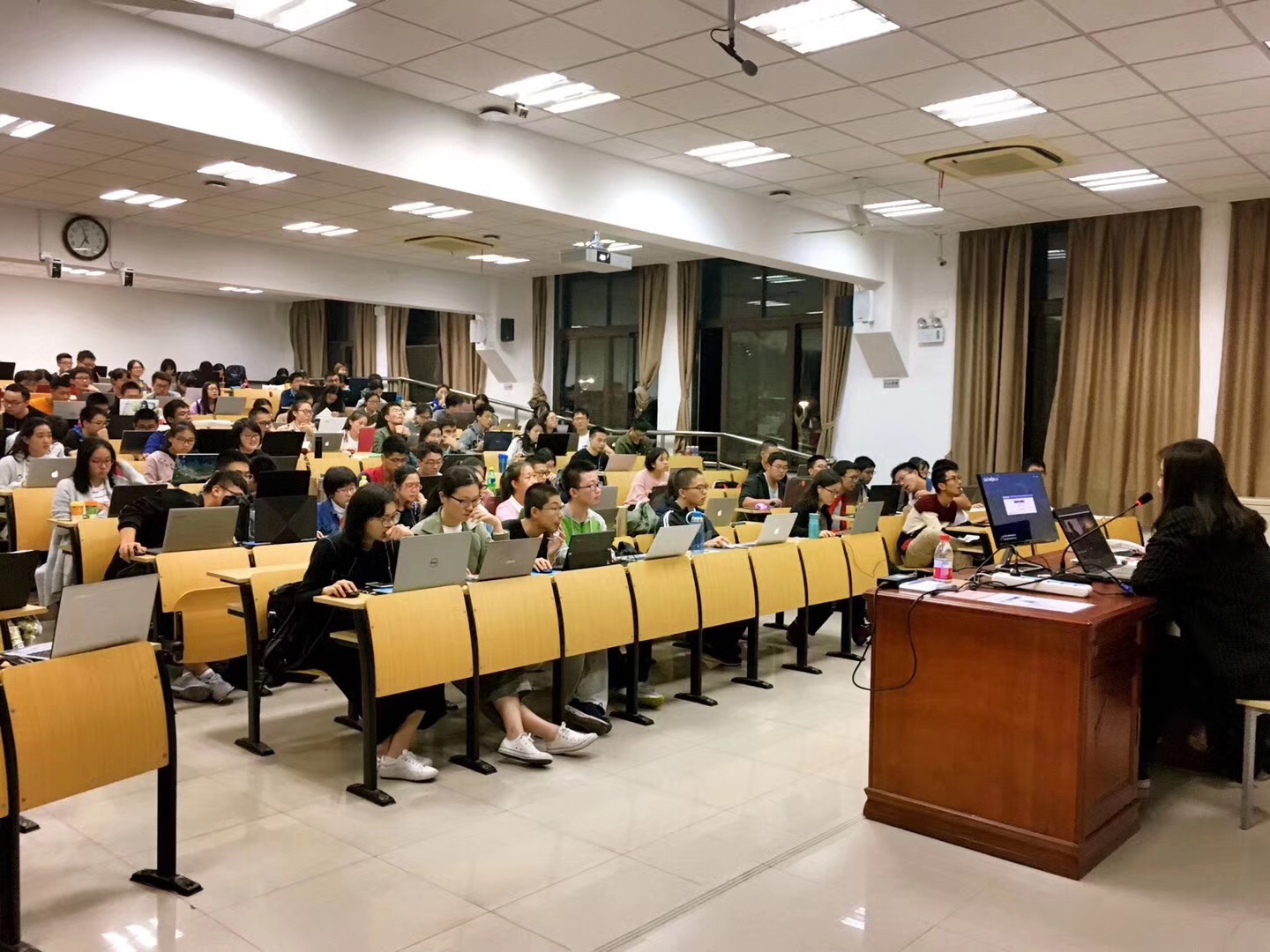 课程在18:30准时开始。吴昊如学姐首先展示了本节课的目标作品,画面与音效配合地天衣无缝,引人入胜,学员们迫不及待地打开自带的电脑、准备好笔记本,跃跃欲试。紧接着就进入了教学环节。学姐耐心讲授,每一步骤、每个细节都讲解地十分细致认真,每一关键步骤完成后,也都会询问学员们的完成情况,确保大家都能听得懂、跟得上。学员们全神贯注地听讲,积极记录要点,根据学姐的讲解,各自在电脑上进行操作,遇到问题,能够及时举手寻求帮助,积极参与到课堂互动中来,课堂气氛十分活跃。