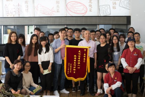 最后活动在几盆包好的粽子、同学们积分卡上一笔又一笔的打分中结束,同学们和在场的春晖食堂叔叔阿姨一起合了影,班长为感谢春晖食堂的师傅们在此次活动中给予我们的支持和帮助,赠送了一面锦旗给师傅,十分感谢春晖食堂在场地、时间、材料上给予我们的支持。此次游园会与包粽子活动中,同学们既在游戏收获了快乐、在包粽子中学习了技能,也在集体活动中感受到了班集体的存在与影响力,增进了同学们之间的友谊与班级集体责任感,支持班集体建设的思想内化于心,外化于行。
