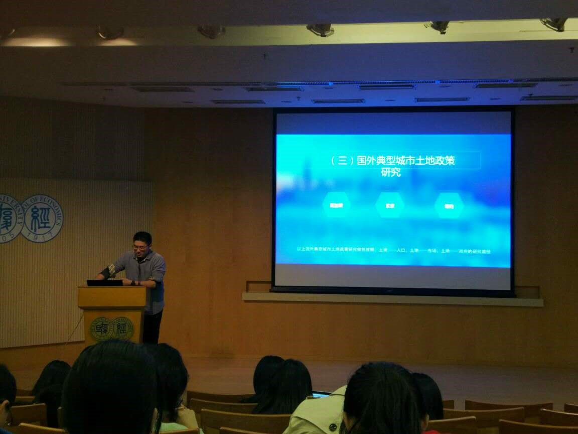 第二组梁焜同学组研究的课题是《中外土地政策比较研究—上海土地政策与国外典型城市比较》, 指出土地政策不仅仅是住房政策,还牵扯到地权、土地金融政策、土地财政政策,对此他就新加坡土地人口方面、东京土地市场方面、纽约财政方面来与上海政策分别对比,另外他指出我们应将此视作一种锻炼自我的经历 ,郑老师对此指出要把最终的目的回归到实践性来;