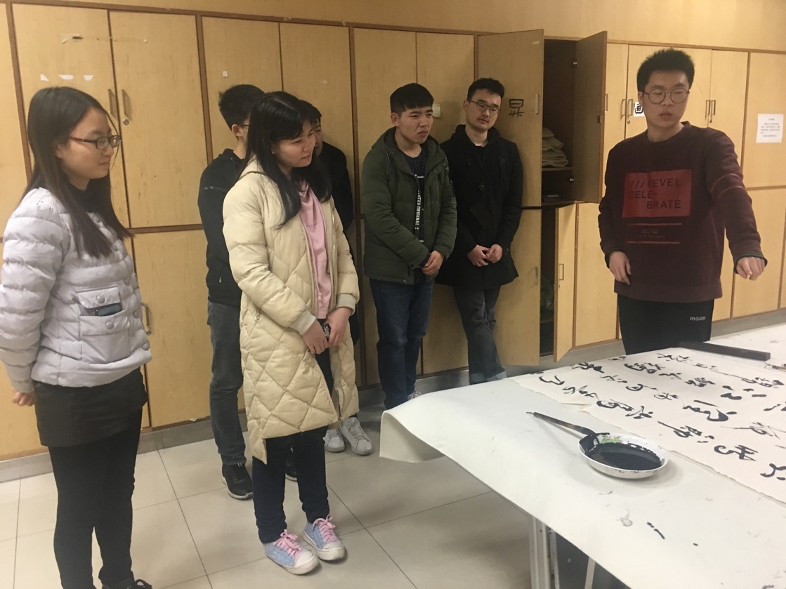 活动开始,为了让大家对书法艺术既有感性认识也有理性理解,伍曼玮同志首先用行草体书写了一副杜甫的《春夜喜雨》。他一边写,一边从偏旁部首的变化、行文运笔的技巧、通篇结构的组织等方面为大家讲解了书法的基础知识,帮助大家更有深度地理解整幅作品的理解。接下来,伍曼玮同志又为大家展示了楷书、隶书、小篆等不同字体的独特魅力,方正平直的楷书、“蚕头雁尾”的隶书、古朴厚重的篆书令大家印象深刻,感叹于中华文化在千年流变、一脉相承中反映出的不同时代的风格气象。