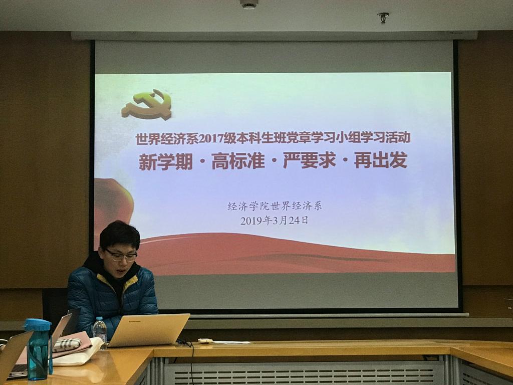 世界经济系2017级本科生班于3月24日晚在泛海楼514召开党章学习小组第二次学习会。本次学习会主要分为三个环节:入党流程、材料规范,博士生讲师团讲师详解中美贸易摩擦及中国相应的经济调整,和预告本学期党章学习小组整体学习计划和活动安排。