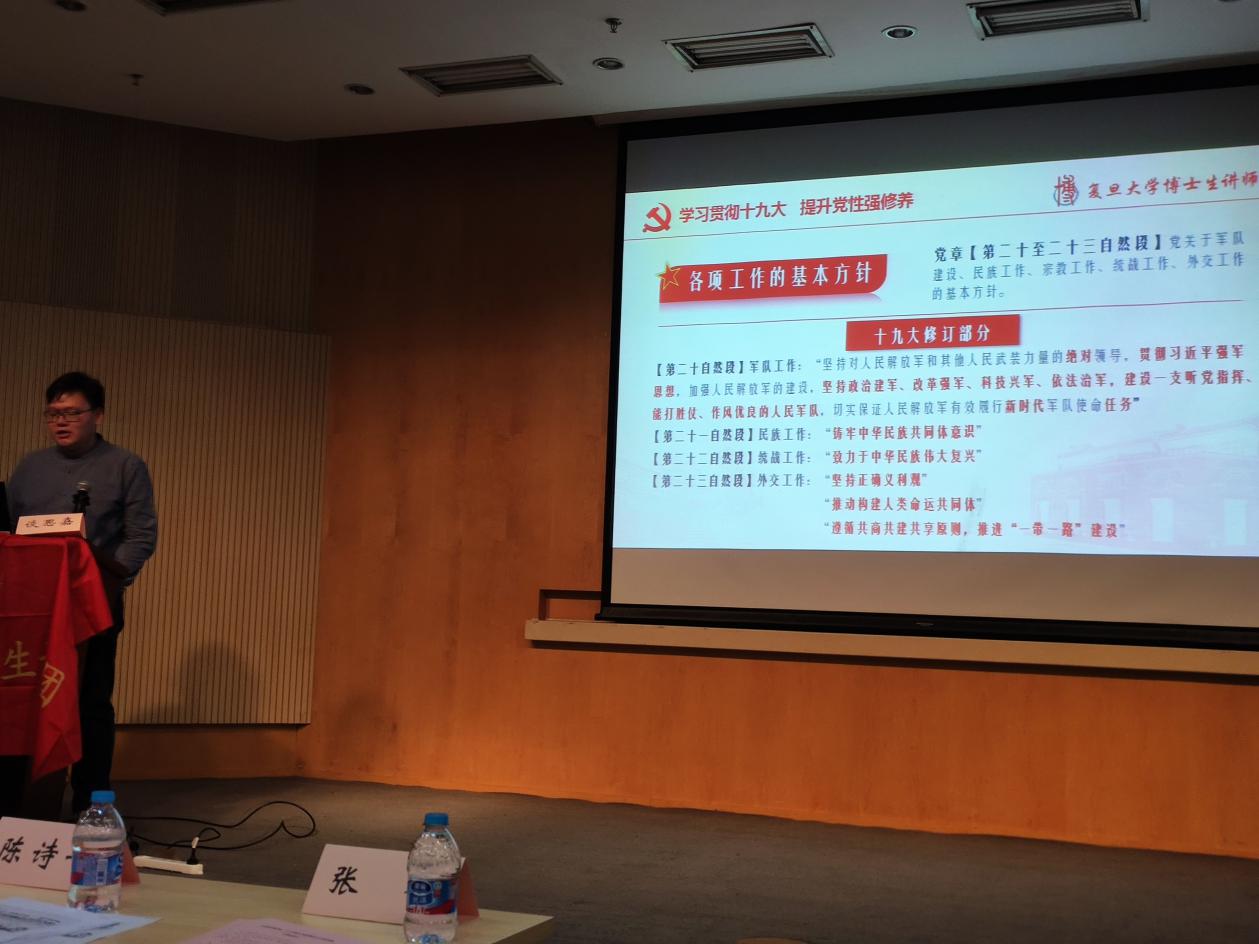 最后谈思嘉老师对于十九大过程中党章的修订过程进行了详细的说明,既表明了党章修订的严肃性,也说明了党对于党章作为党的根本大法的重视。老师希望同学们在培训班之后的学习过程中大家能继续认真党章的相关内容,牢记中华民族伟大复兴的使命,永远坚持奋斗,早日成为一名合格的共产党员。