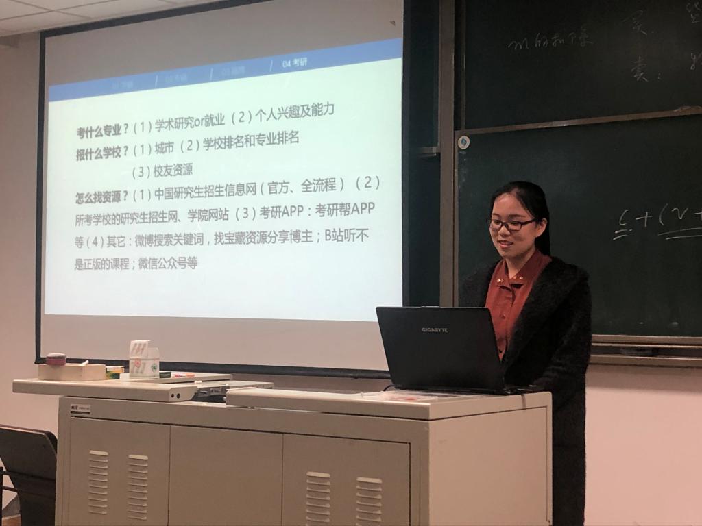 首先,来自15级的刘庭汐学姐与张博凡学长先后向同学们进行了学硕与专硕的相关分享。两位同学的分享都是从自己选择学硕或专硕的原因谈起,随后,刘庭汐学姐谈及了自己面试学硕的经历及其大致内容,总结了三点影响保研学硕的重要因素,并在最后给出了两点建议。而张博凡学长则较为详细地介绍了流程与时间节点,并以身边同学险些错失保研机会的教训,强调了几点事项。在介绍竞争情况与对策后,进行了三点总结。