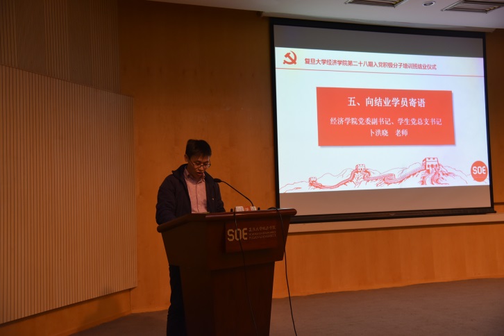 最后卜洪晓老师提出了对学员们的希冀,通过本次党校,学员们对中国共产党的认识更加系统、更加全面,入党动机进一步端正,也大家找到了自己今后要努力的方向,因此他希望学员们以本次培训为新起点,不断加强自己的党性修养,努力从思想上和行动上向党组织靠拢,求实创新,为把我校建成国际知名、世界一流大学而奋斗,同时面向新世纪,肩负起时代赋予的崇高责任,承前启后,继往开来,为祖国做贡献,为人民服务,把党的伟大事业发扬光大。