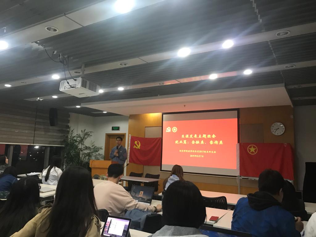 世界经济系2017级本科生班以“笃志敏行,扬帆起航”为主题,于5月7日在泛海楼801举行生涯发展主题班会。本次主题班会请到了两名优秀的党员师姐,主要就金融和咨询两大类职业发展,为同学们做了精彩的发言分享,并为大家答疑解惑。
