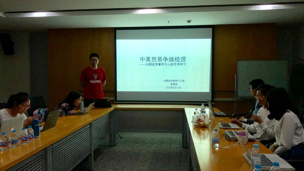 泛海楼614会议室,结合专业优势研讨时事政治,开展了以中美贸易争端为线索的主题研讨会,张嘉诚同学主持了此次专项学习。通过系统而专业的梳理与分析,让同学们对中美贸易摩擦的历史与最新进展有了深刻的了解,帮助大家知晓国家时事,坚定理想信念,厚植爱国情怀。