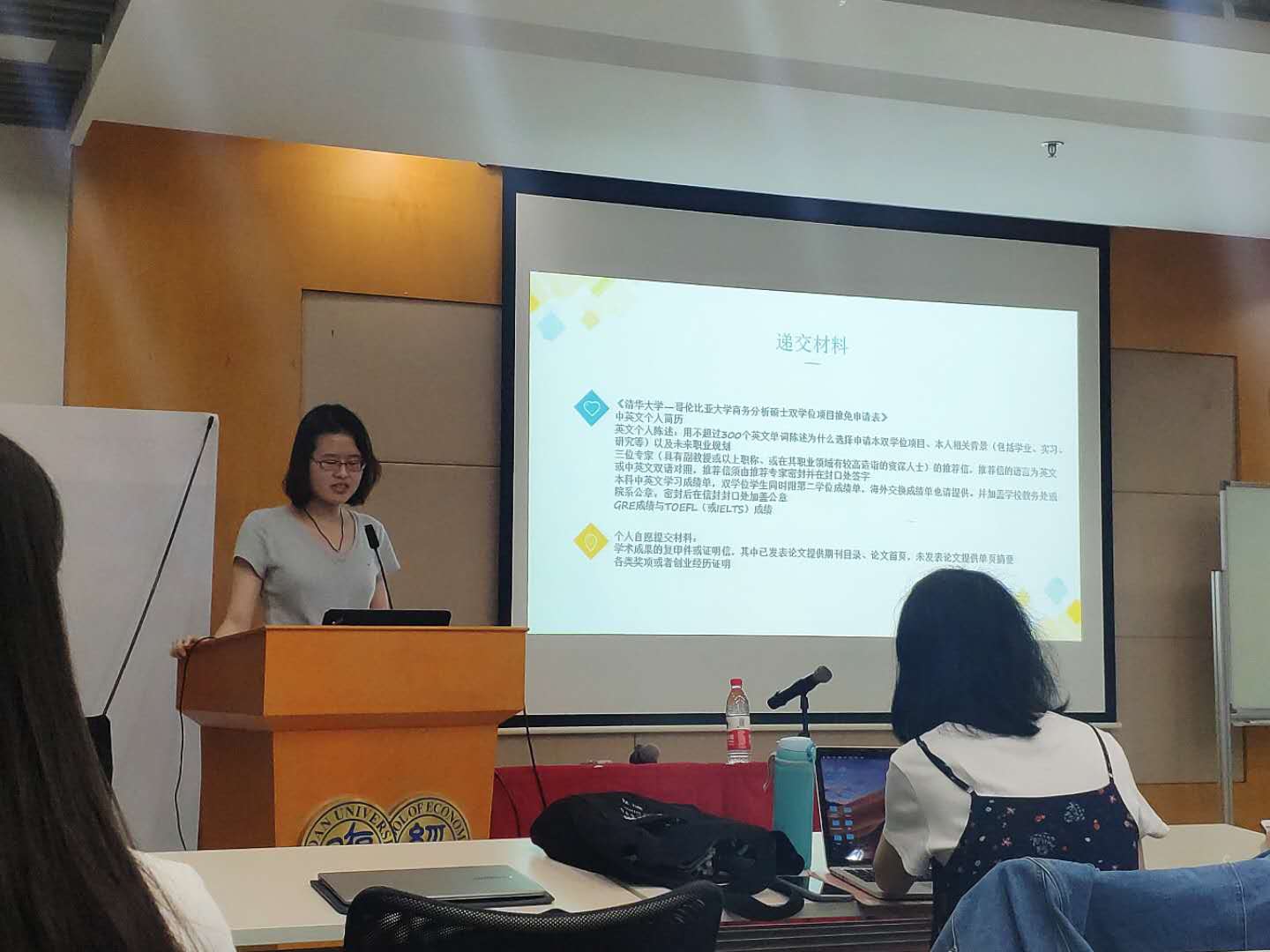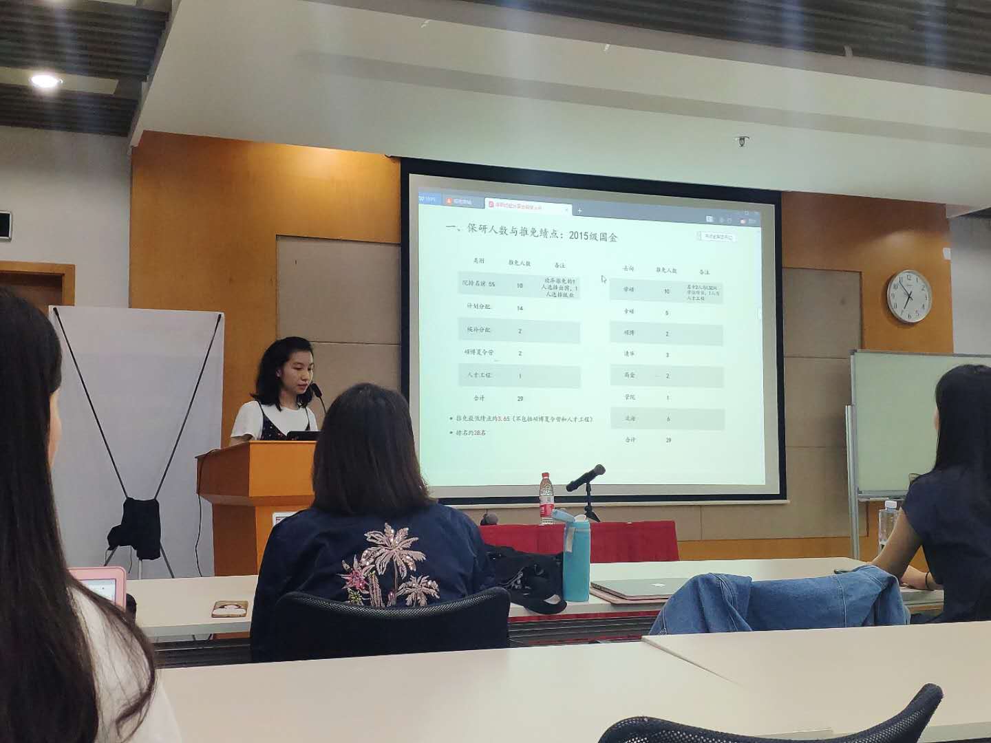 接下来由金霜莹学姐讲述了复旦经院本校保研的那些事。金学姐列出了经院保研人数和推免的最低绩点。同时学姐也指出保研除了计划的名额还有很多种方式,可以选择考虑夏令营、人才工程、研究生支教团和参军返校等等。找到最合适自己的那条道路才最重要。之后,学姐还介绍了面试的内容,面试老师主要会对专业知识提问,同时也会考察对时事的理解。学姐提醒大家在保研面试前的那个暑假可以复习一遍专业课知识。