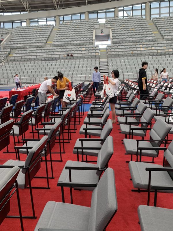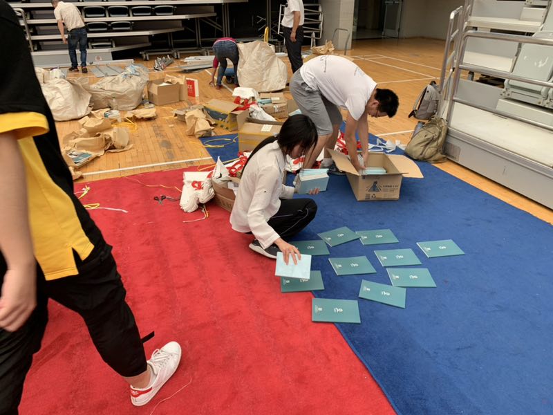 当装好的手提袋数量逐渐增多、开始在工作场地中堆积时,同学们及时地将它们按要求整齐摆放到毕业生的座位上。不少女同学两手提着十多只沉重的袋子来回数次,男生们也任劳任怨、反复多趟地摆放纪念品。一个多小时过去,大家终于圆满完成了任务,会场里所有毕业生座位都被整齐划一地放置了纪念品。尽管手臂和腿都因长时间跪坐和提重物而感到酸疼,但想着自己为毕业典礼作出的小小贡献,大家都倍感光荣。