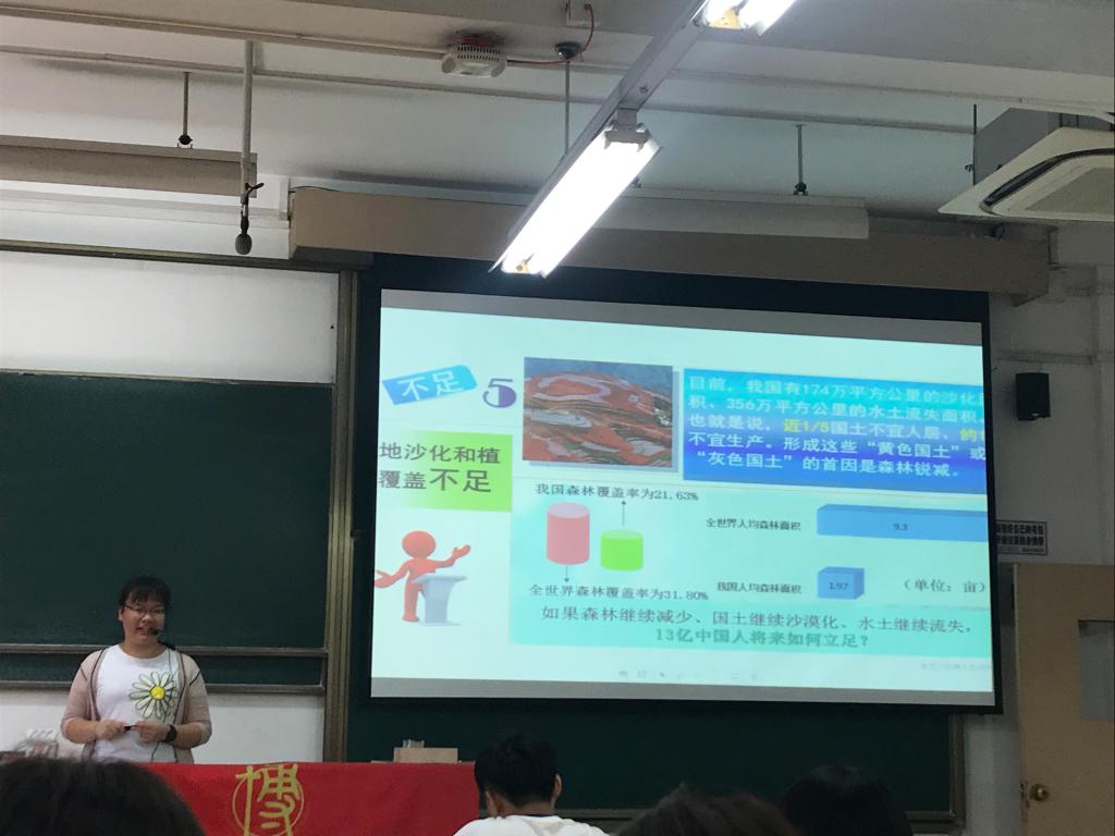 杨老师首先肯定了这些年来我国的环保建设工作已经取得的较为显著的成绩,其中最为人熟知的便是阿里巴巴公司旗下蚂蚁金服的蚂蚁森林,在我们看不见的地方改善着这个国家乃至世界的环境。但是杨老师同时也指出,我们也应意识到,我们所热爱的这个国家目前的环境条件还不足以使我们过于乐观。我们虽然地大物博,但是因为存在庞大的人口基数,我们的人均资源是比较匮乏的。同时也是因为巨大的人口基数,我们的生活垃圾产生量也是位居世界前列的,这并不是值得炫耀的成绩,更何况我们的垃圾处理能力和产生量是不成正比的。同时空气污染和土地污染也是我们现在面临的问题,所以现在我们面临的环保形势是比较严峻的。