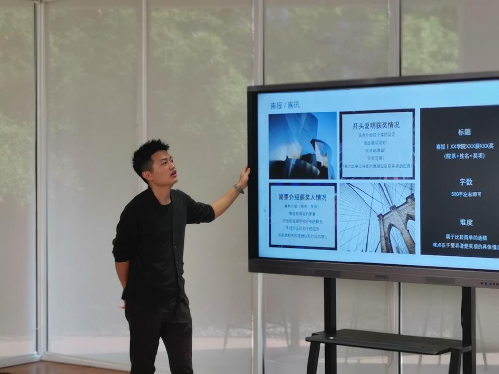 培训的第二个环节是写作训练。来自新闻学院的2019级新媒体专业硕士刘浏同学基于丰富的写稿经验,为各位信息员们梳理了通讯稿写作的基本原则与常用技巧。首先,刘浏同学提到通讯稿的三大原则——真实性、客观性和“倒金字塔”结构,帮助信息员们对通讯稿的写作有了基本的概念。刘浏同学将通讯稿分为六大类别,分别是实践通稿、党建/团建通稿、赛报、讲座/论坛/会议通稿、喜讯/喜报和人物通讯稿,,并结合实际案例样稿总结了有针对性的写作要点。最后,刘浏同学为大家介绍了《人物》、《半月谈》等优秀的媒体,鼓励大家多学、多练,在模仿中掌握技巧,在实践中提高水平。