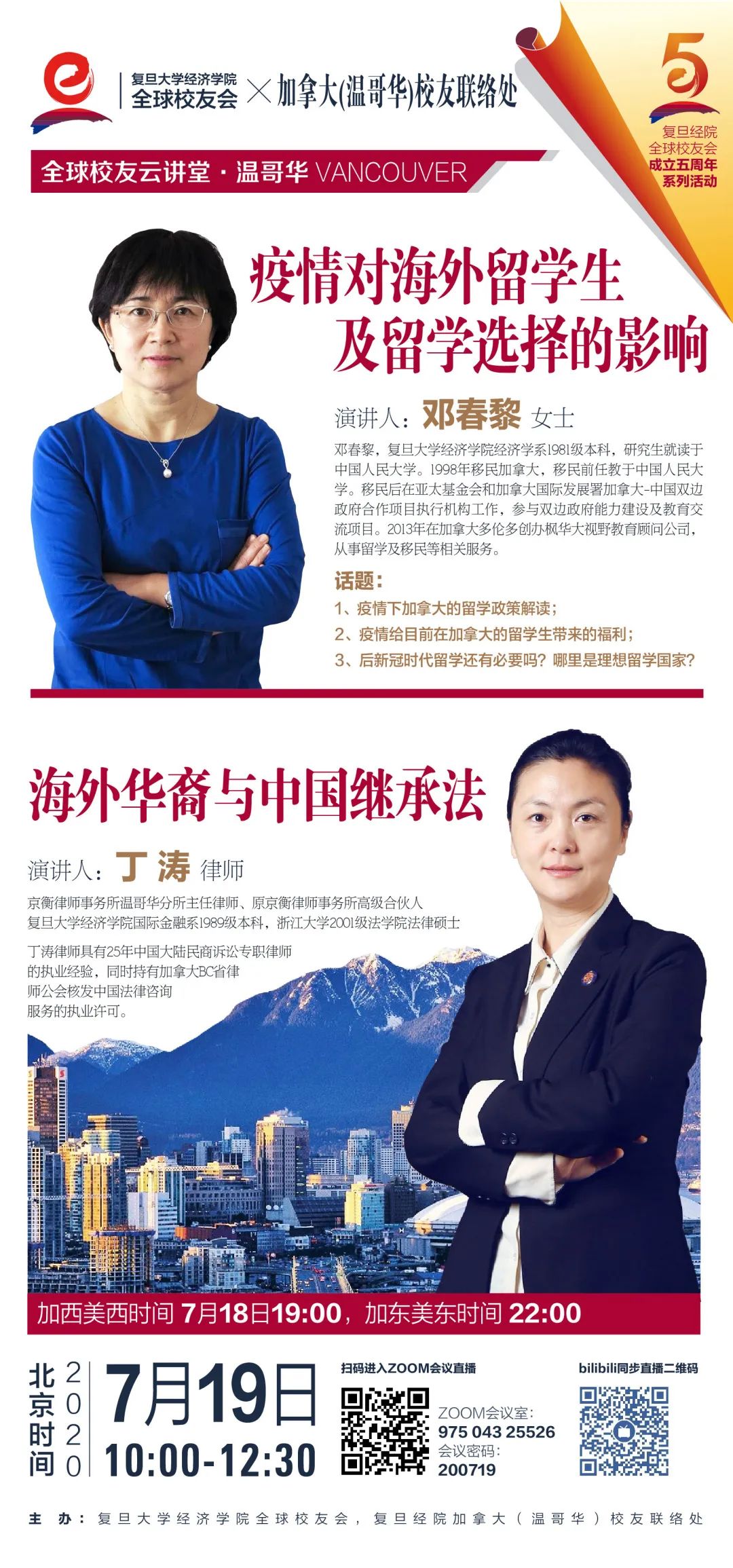 2020年7月19日,“复旦经院全球校友云讲堂” 加拿大(温哥华)站在ZOOM会议在线召开,并在bilibili直播平台同步直播。本次云讲堂由无码流出