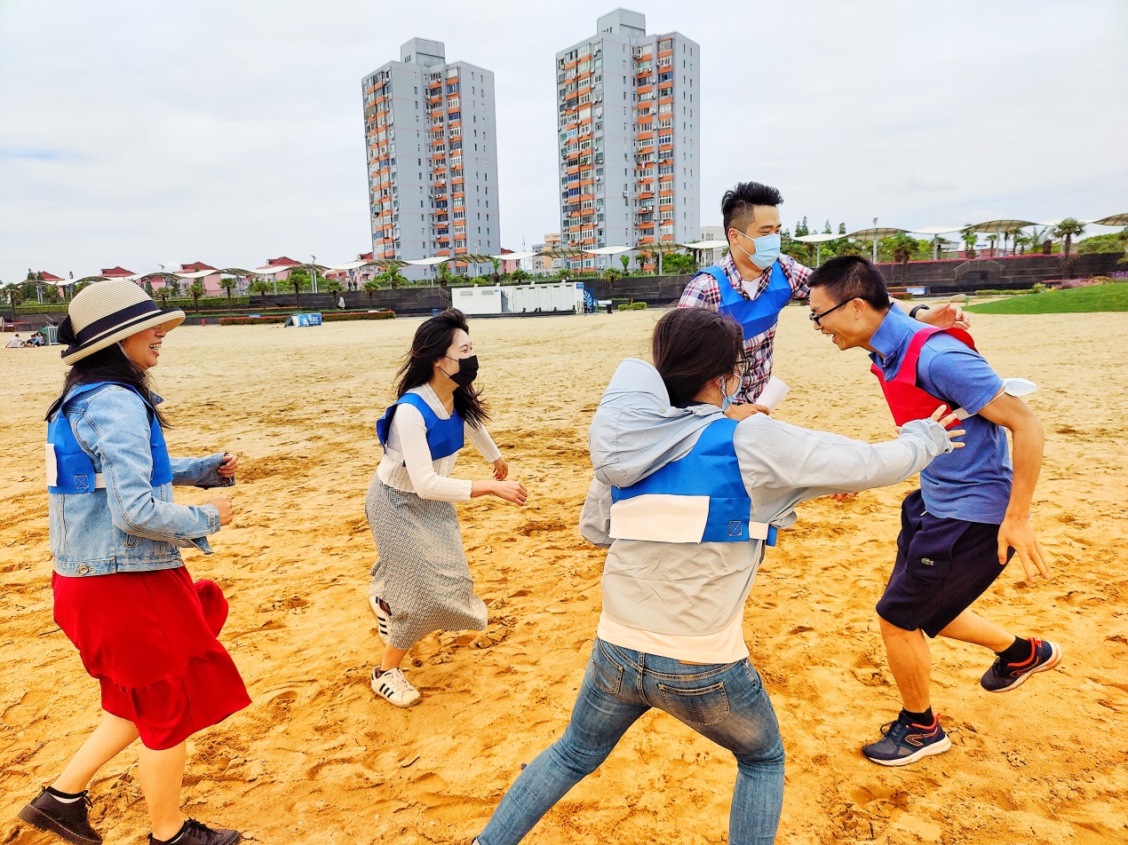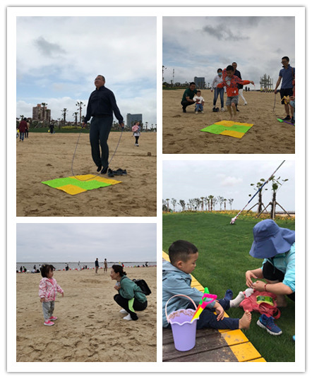 本次活动的第一站是在集海景、海趣、海乐、海韵为一体的金山城市沙滩。阳光流转下的金色细沙与一望无际的蔚蓝海水交相辉映,小朋友们带着玩沙工具向着沙滩跑去,老师们赤足漫步于沙滩上,望海天浩瀚,横无际涯;听惊涛拍岸,惠风和畅。为增加大家的互动,学院还在沙滩上精心设置了撕名牌、两人三足、快乐指压板、丢沙包等趣味游戏,使大家在感受沙滩无尽魅力的同时,让身心得到全然的放松。