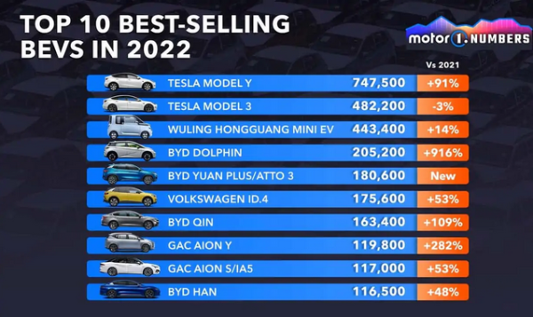 ▲中国电动汽车市场的发展迅猛,2022年全球纯电动车销量前10名中有7名来自中国品牌,特斯拉两款车型销量暂时领先