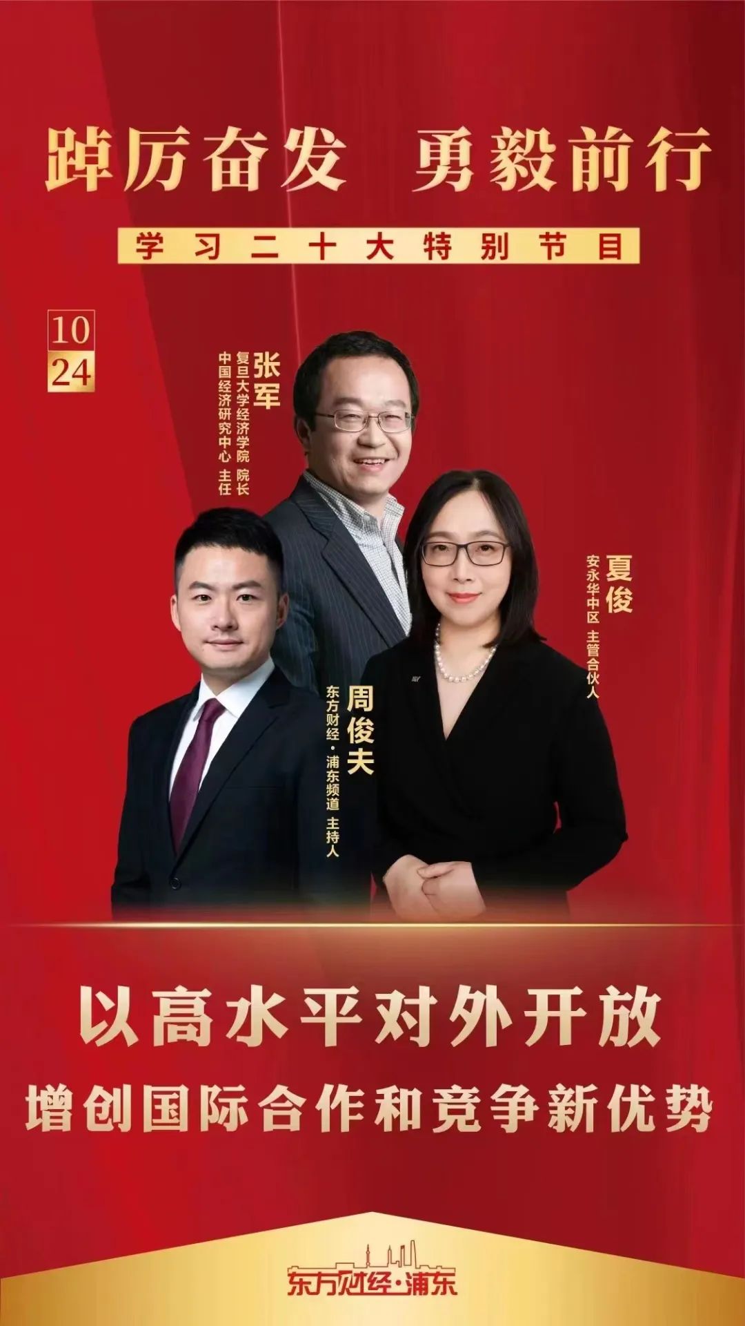 院长张军应邀作客东方卫视《今晚》节目,就加快构建新发展格局发表评论,提出要以高水平开放进一步提升国际循环质量,形成两个循环的相互促进;应邀做客《东方财经•浦东》频道“踔厉奋发,勇毅前行”节目,提出以高水平对外开放增创国际合作和竞争新优势;接受Economics一克纳米采访,对国内国际双循环的新发展格局作出精彩解读,提出只有在技术实现了两个循环相互促进的格局之后,双循环的格局才能够真正的形成。二十大开幕会后,世界经济学科多位学者热议二十大报告,被东方网报道。孙立坚教授受邀在《21世纪经济报道》发表评论文章《加快构建新发展格局,着力推动高质量发展》。