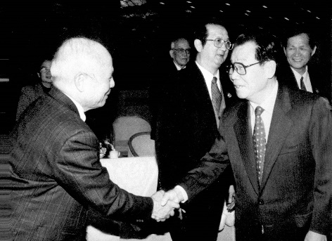 全国政协主席李瑞环与全国政协常委郑励志握手
