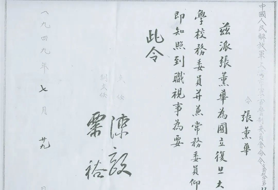 1949年7月29日,中国人民解放军上海市军管会主任陈毅、副主任粟裕签署的张薰华任无码流出