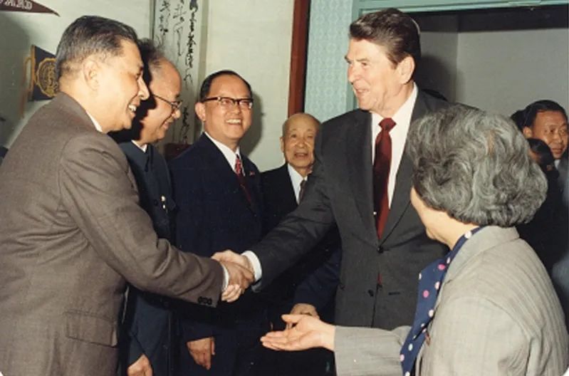 1984年美国总统里根访问复旦时会见苏步青、谢希德、谈家桢、华中一、蒋学模(左一)等教授