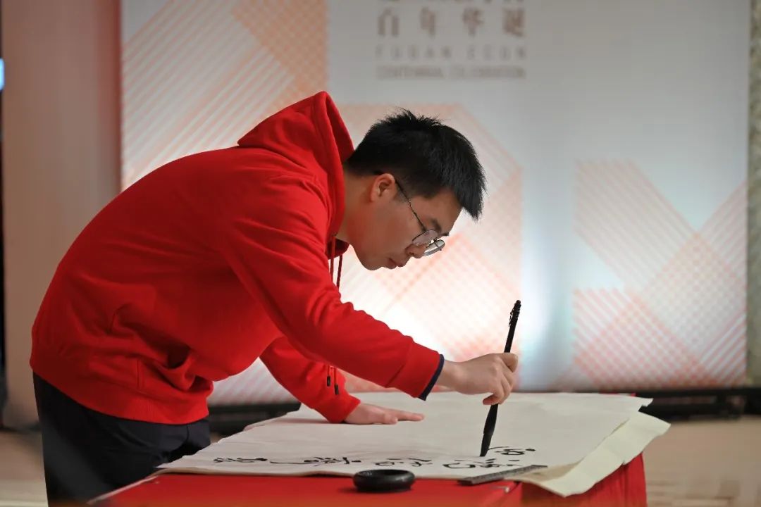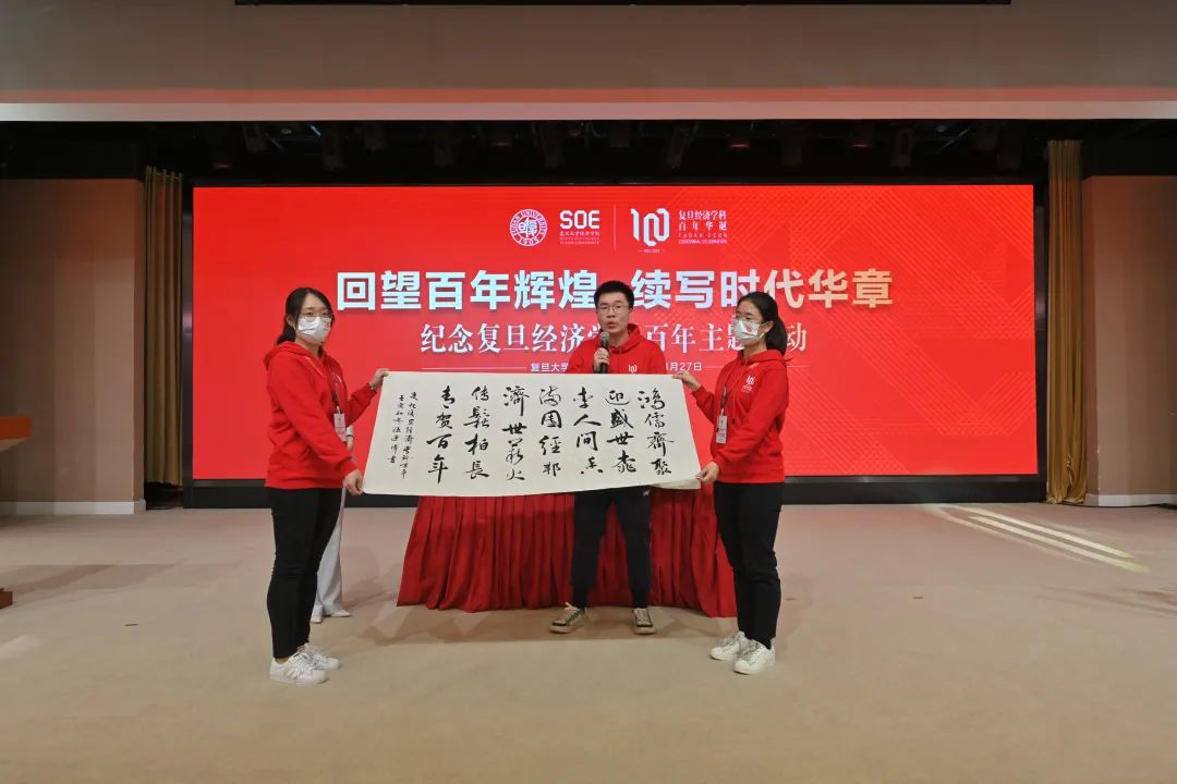 科学硕士研究生伍曼玮现场写就一副书法作品,为学院送上美好祝福:“鸿儒齐聚迎盛世,桃李人间香满园。经邦济世薪火传,松柏长青贺百年。”