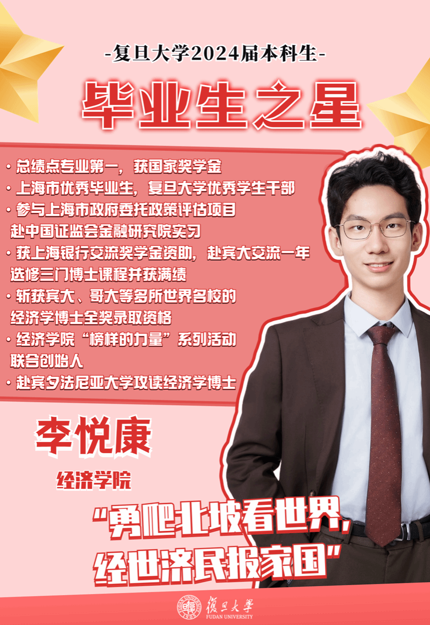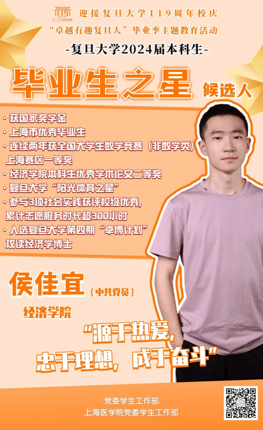 为全面推进“时代新人铸魂工程”,落实立德树人根本任务,选出一批优秀毕业生典型,展示学校综合育人成效,体现复旦毕业生心怀理想、素质能力突出、善于解决问题、多才多艺、生动有趣的风采特质。今年4月,学校启动了2024届本科生“毕业生之星”风采展评活动。