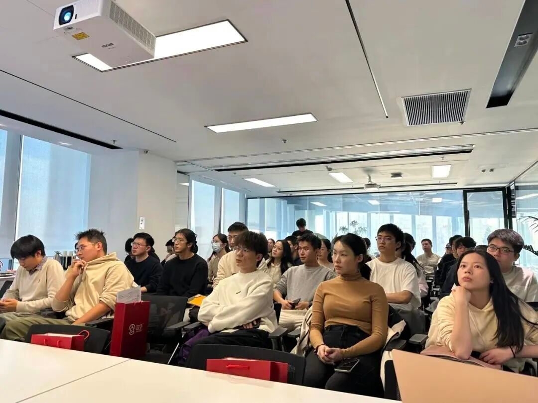 活动伊始,在念空企业工作人员的带领下,同学们首先参观了公司整体环境。念空企业占据完整一层办公空间,面积达 2000 平米,采用半开放式办公室布局,既保障了工作交流的便捷性,也为员工保留了相对独立的思考空间。办公区内设施一应俱全,不仅配备了专业的办公设备,还设有健身房、休息区,甚至专门为海外分公司合伙人打造了独立办公室,细节之处尽显公司对员工工作与生活平衡的重视,也让同学们直观感受到了量化金融企业高效、舒适的工作氛围。