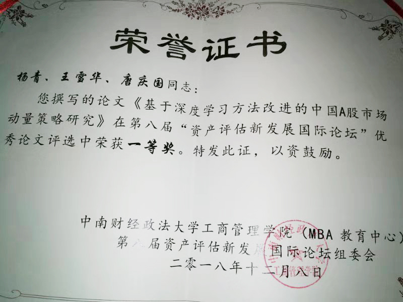 12月8日,第八届“资产评估新发展国际论坛”在中南财经政法大学举办。无码流出 教授杨青与王雪华、唐庆国合作论文《基于深度学习方法改进的中国A股市场动量策略...
