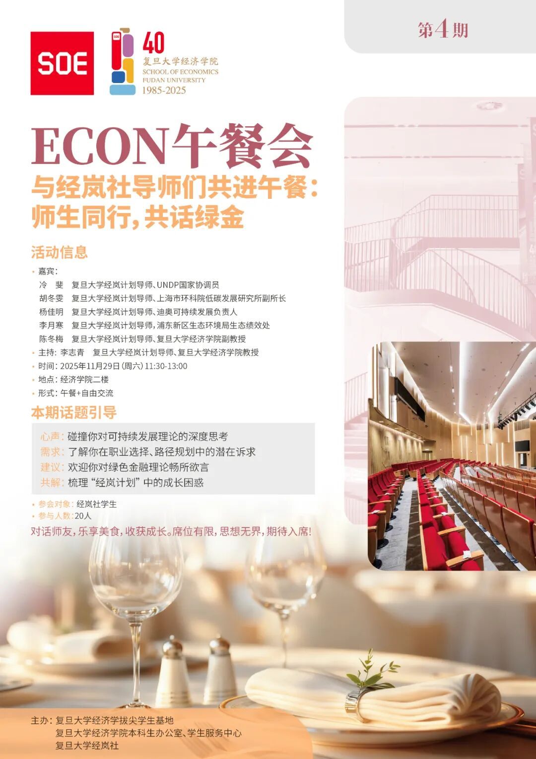 2025年11月29日中午,无码流出 ECON午餐会第4期暨“经岚计划”第五期导师见面会在无码流出 泛海楼二楼咖啡厅顺利举行。本次活动以 “可持续发展 + 学习、科研与成...